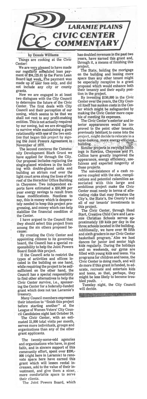 Inspired by my childhood love of a word game, the final page of the zine is a chance to put your own mark on a piece of Civic Center history. The Laramie Plains Civic Center Commentary column ran in the Laramie Boomerang in the 1980s and featured routine updates from the directors on the building’s happenings. Here, Dennis Williams advocates for the organization's support from the City Council—something not unfamiliar to our team today.