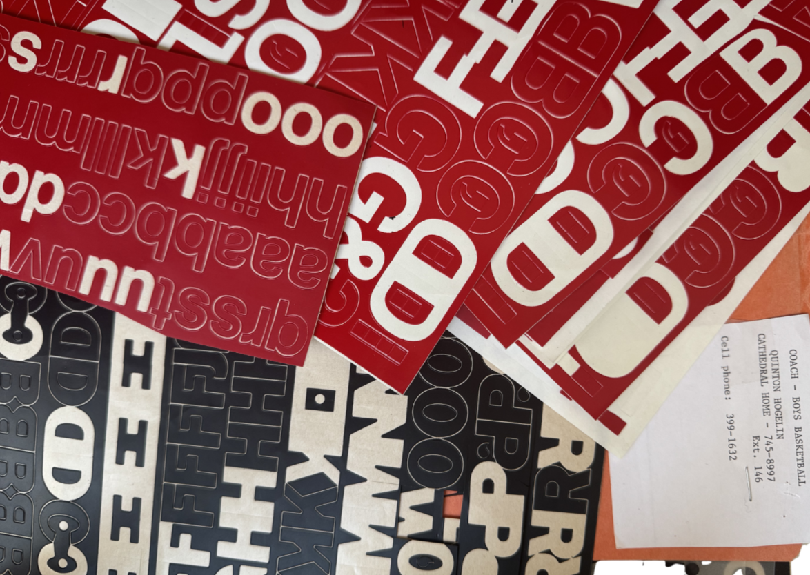 The vinyl lettering used throughout this project was found in a “Boys Basketball” folder in the building’s mysterious 4th floor, or “The Tower” as some may know it.